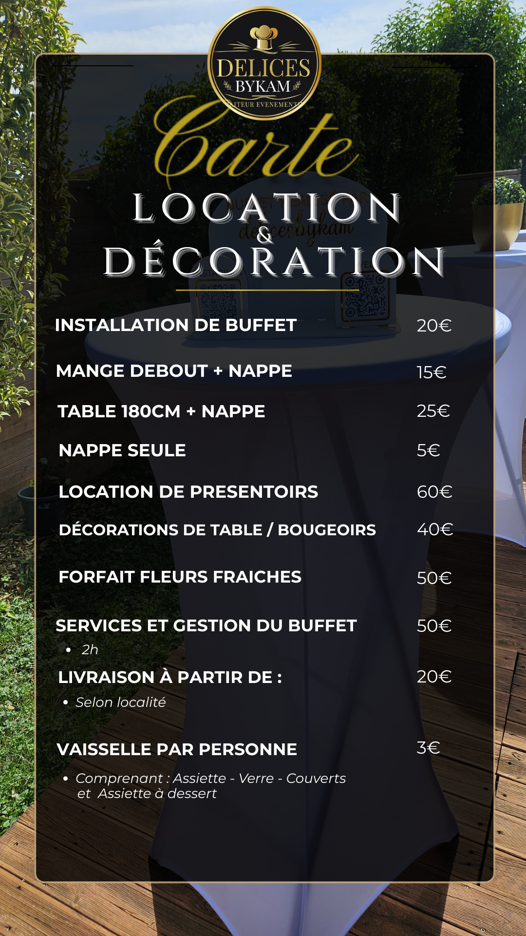 SI VOUS N’AVEZ PAS LE MATÉRIEL NÉCESSAIRE POUR VOTRE ÉVÉNEMENT DON’T PANIC ! NOUS DISPOSONS DE TOUT CE QU’IL FAUT POUR LA MISE EN OEUVRE DE VOS BUFFETS, CONSULTER NOTRE CARTE LOCATION ET DÉCORATION CI-DESSOUS ET N’HÉSITEZ PAS à NOUS FAIRE UN MAIL SI BESOIN DE RENSEIGNEMENTS SUPPLÉMENTAIRES à : DELICESBYKAM@OUTLOOK.FR